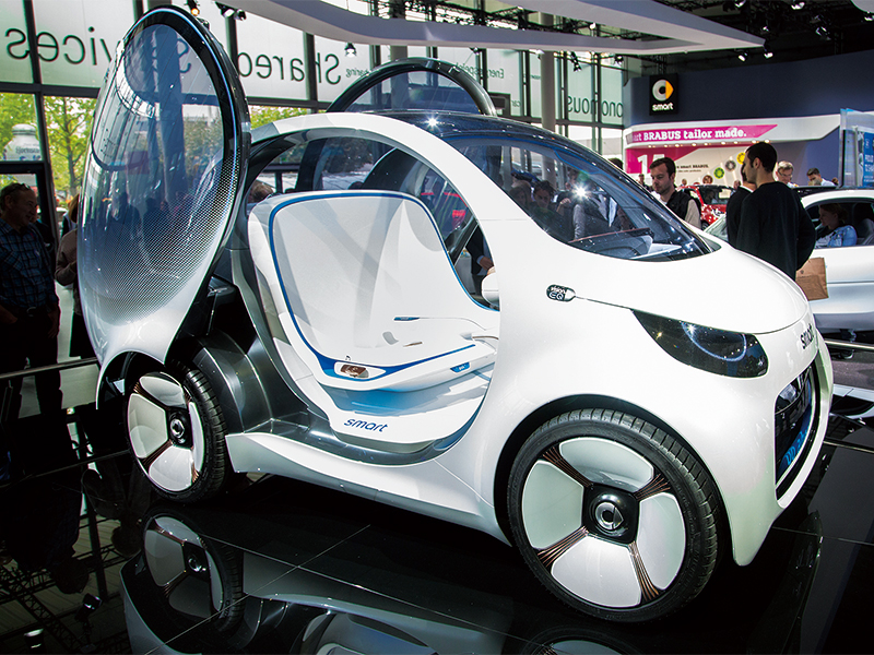 完全自動運転EVのスマートビジョンEQフォーツーは縦回転式ドアを採用し、カーシェアリングも視野に入れる。