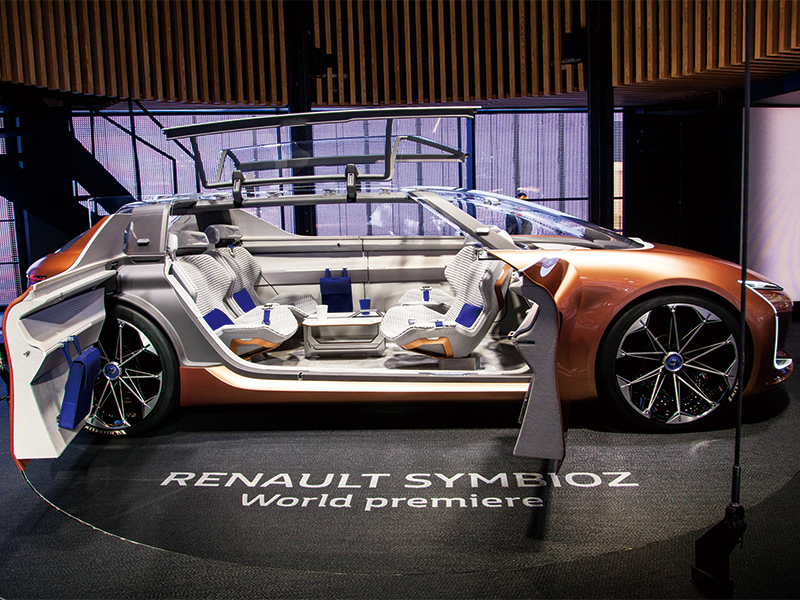 住宅の居心地のよさをクルマに持ち込んだ大胆なコンセプトのルノー・シンビオズ。2つのモーターをリアに搭載している。自動運転のときは前席を後ろ向きにして、リビング感覚に。