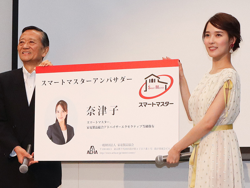 今回のスマートマスター認定試験には、タレント・女優の奈津子氏も合格している。同協会では奈津子氏を「マスートマスターアンバサダー」に任命し、この日の式典において任命式が行われた。奈津子氏は芸能活動の傍ら、これまでも家電製品総合アドバイザーエグゼクティブ等級の資格を取得しており、独自の視点によるレビューを雑誌やテレビ・ラジオ等で発信している。挨拶に立った奈津子氏は、「スマートマスターの資格取得を機に、さらに活躍の場を広げていきたい」と意欲を示す。