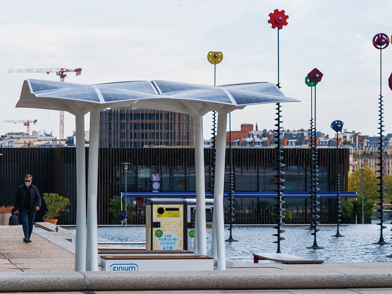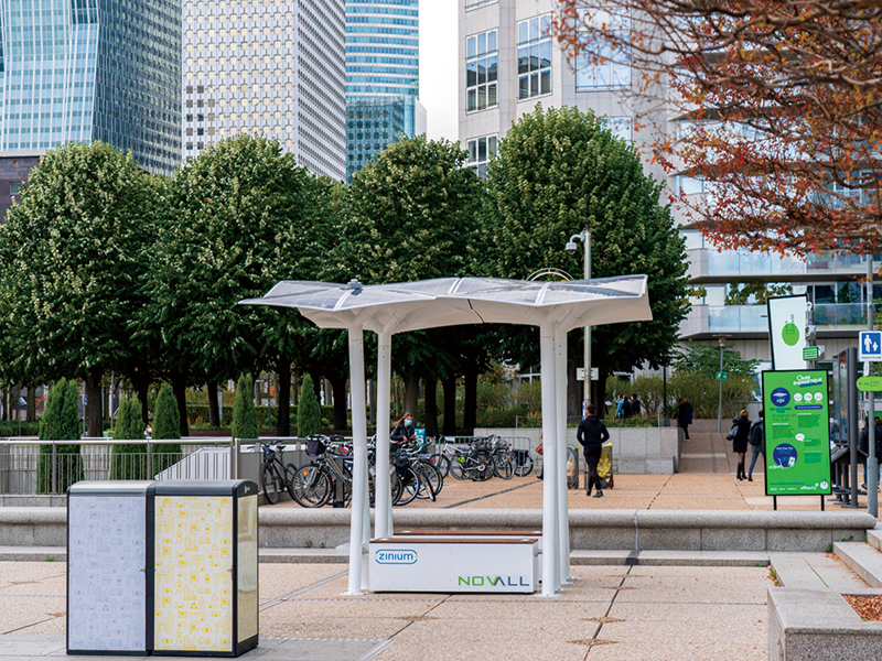上部に太陽光パネルが葉のように広がる木陰のような形の「ソレアー」など、スタートアップが開発した革新的な発電装置を、電動キックスケーターの充電用に充てている。9月中旬から6ヶ月間のテストで有用性が認められれば、規模を拡大して継続される予定だ。