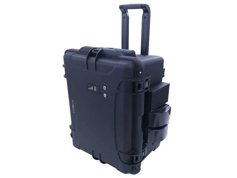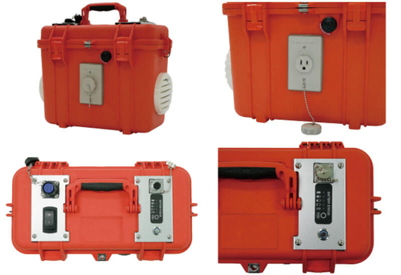 災害時の緊急電源や工事建設機械の電源として、 屋外で使用可能な防水仕様の蓄電池。高い防水仕様(IP45)と耐震設計により衝撃にも強く雨天時の工事現場などあらゆる環境に対応。電池容量1kWh、出力AC100V/500W。