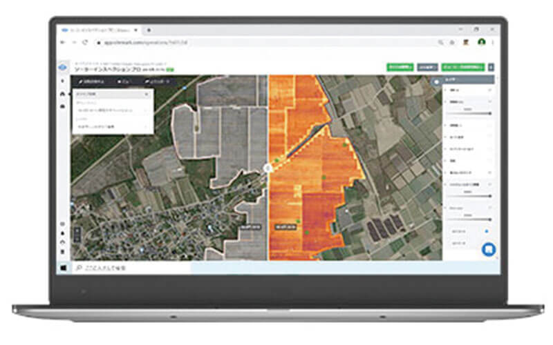 ドローンによるサーモグラフィー検査、空撮データからAI搭載ソフトウエアでパネルの熱異常を自動解析。保守・点検業務をデジタル化し、省人化と正確な点検を支援するツール。◆全国対応 ◆2020年度実績(国内:600MWp)