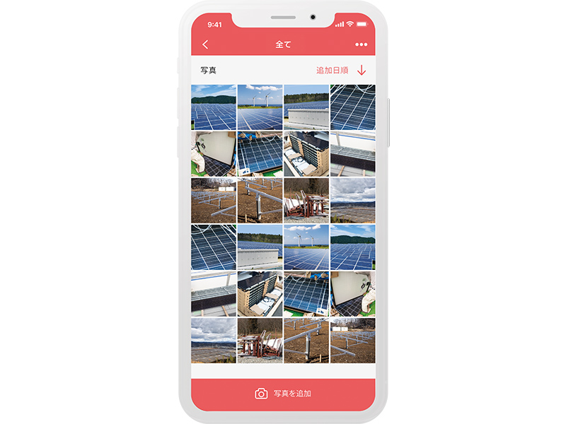 太陽光発電所の現場で撮影した画像を、ANDPADにアップするだけで、チーム内でカンタン共有。ANDPADのチャット機能で報告もスムーズ。画像に限らずプロジェクトに関わる情報をすぐにシェアできるのがポイントだ。