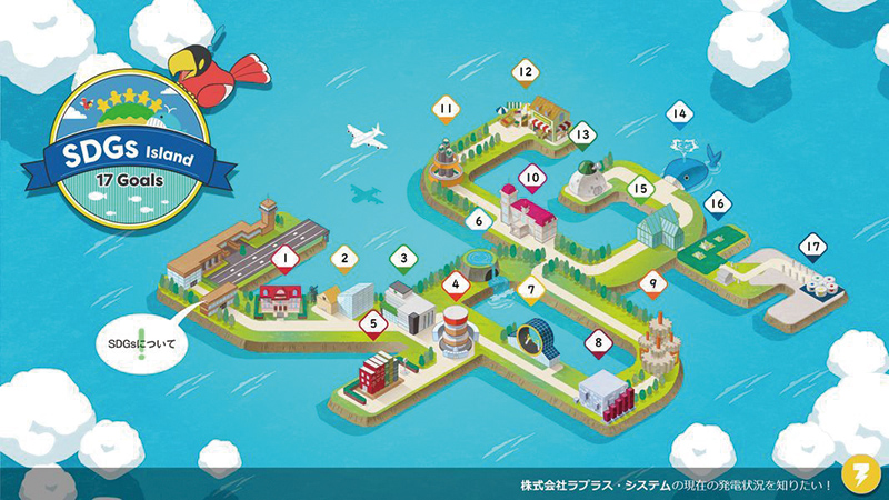 遠隔監視システム&サービスL・eyeと連動しWebブラウザで発電状況を見える化。SDGsの概要や17の目標についてアニメーションでわかりやすく解説し、取り組む意義をPRする。