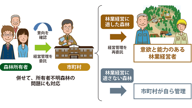 森林所有者にとっては、市町村が介在してくれることにより、長期的に、安心して所有森林を任せられる。また、意欲と能力のある林業経営者に、所有森林の経営管理を委ねることで、所有森林からの収益の確保が期待できる。