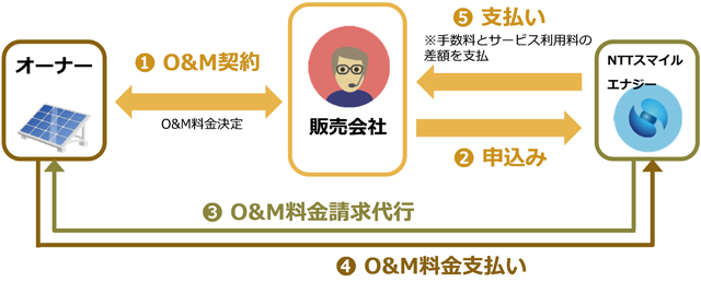 同アラカルトは、O&Mサービスに関わる発電事業者への料金請求を、NTTスマイルエナジーが販売会社に代わって実施するというサービス。契約した販売会社の口座には、発電事業者への請求金額から、NTTスマイルエナジーの各種サービス利用料を差し引いた金額が振り込まれることになる。