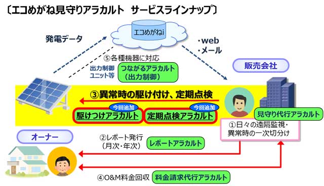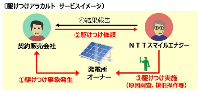 「駆けつけアラカルト」は、「エコめがね」による遠隔監視(発電状況、発電設備の見守り等)で異常が検出された際、NTTスマイルエナジーが販売会社に代わって現地に駆けつけるというサービス。同社は販売会社の依頼を受け、派遣手配実施から原則3営業日以内に駆けつけ、目視による原因調査、復旧操作等を実施する。