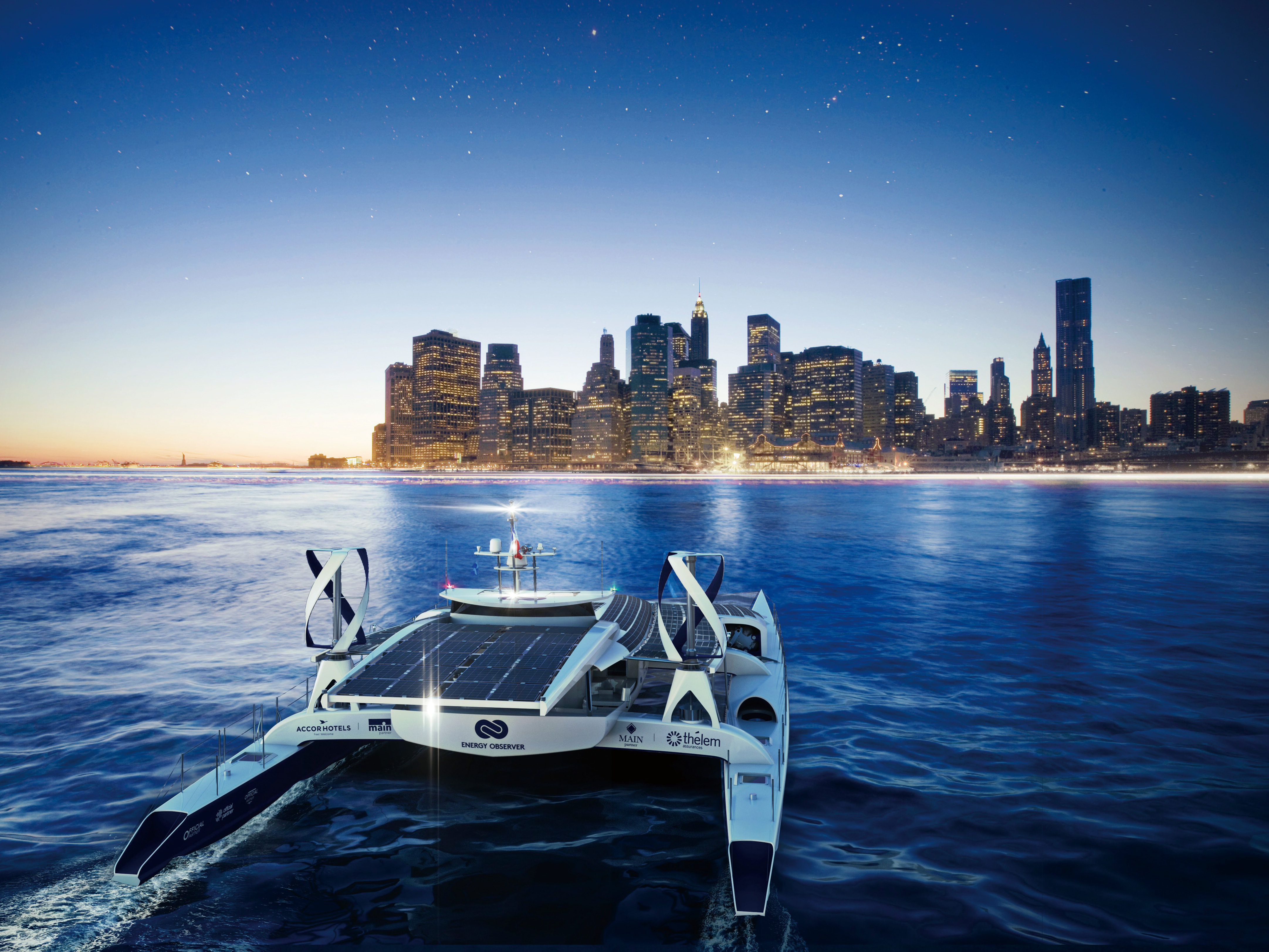 4月14日、再生可能エネルギーだけを動力に航行する双胴船「エナジー・オブザーバー」が、フランス北西部サン・マロで世界一周の航海に向けた進水式を行った。この船は、130㎡のソーラーパネルと2機の風力発電機、海水から水素を生み出す水素電解装置を備えた2機の電気モーターを搭載。無風時や夜間には、備蓄した水素を燃料にして航行する。