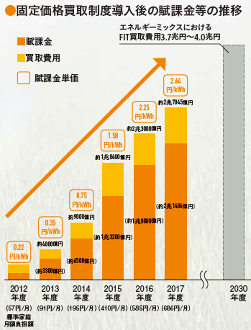 2012年7月のFIT開始以降、電力会社が電気を固定価格で買い取る費用を全ての電力消費者が負担しています。賦課金単価は2012年度0.22円/kWhから2017年度2.64円/kWhと約10倍になり、一般家庭で月850円前後、年間1万円前後の負担増になっています。