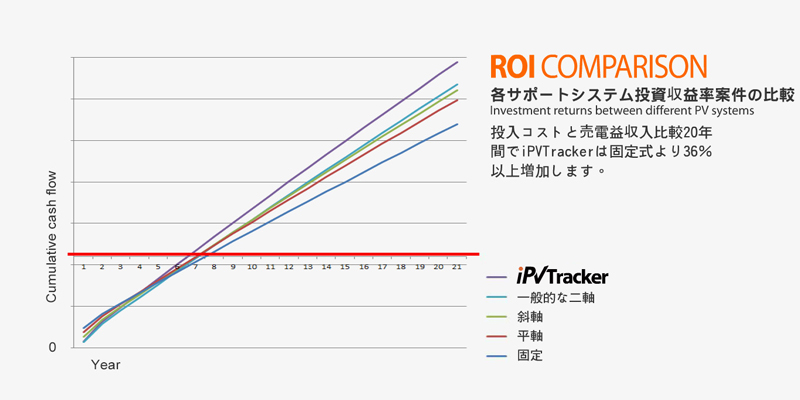 当社のテストでは、固定式よりも発電量が30~100%アップすることが実証されています。追尾式太陽光発電架台「iPV Solar Tracker」は、日本のみならず、台湾、中国、アメリカなど世界中に広がっています。