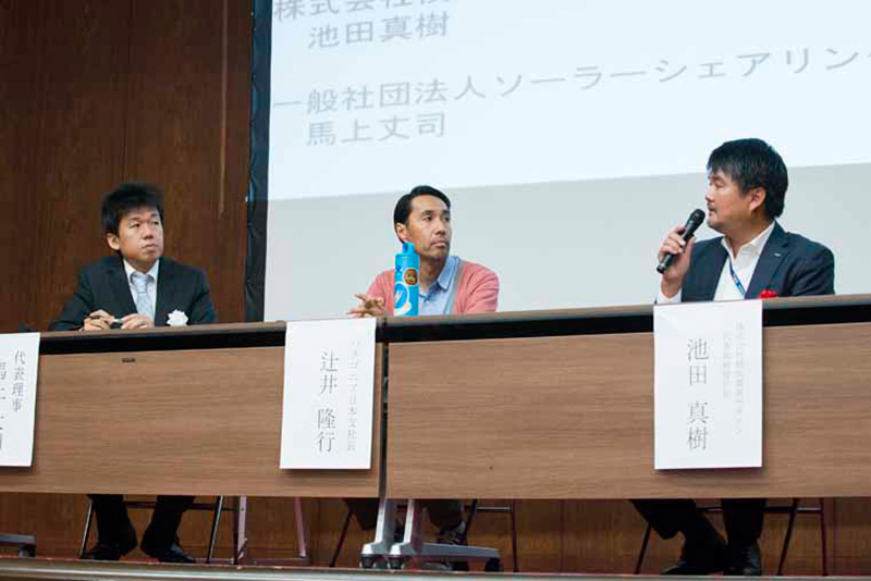 ※注:登壇を予定していた連盟理事の全国ご当地エネルギー協会 佐藤彌右衛門氏が欠席のため、同協会理事も務める飯田氏が急遽駆けつけ登壇した。