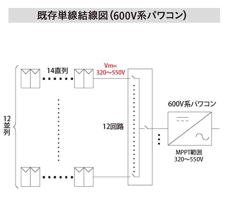 Amptストリングオプティマイザを使えば、旧式の600V系パワコンから1000V系の新型パワコンへの交換が、配線工事や法的な高圧区分への変更なしで可能になる。