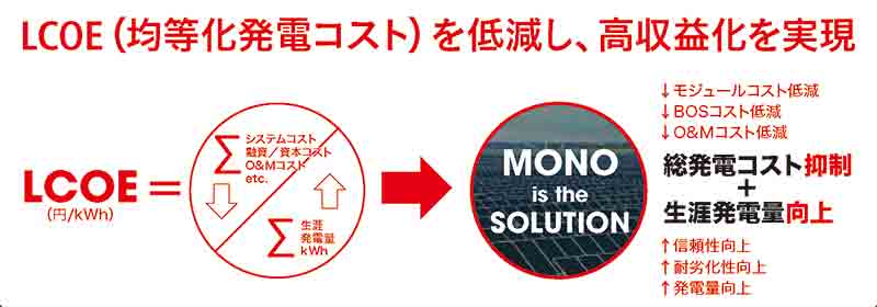 高効率な単結晶モジュールは、発電所用地面積の制約がある場合はもとより、用地の制約がない場合でもメリットがある。モジュール1枚あたりの発電量が増えることにより、一定の発電量を得るための使用枚数を削減でき、用地面積、必要部材(架台・ケーブル等)、工期等の削減により発電所建設のトータルコストを削減することができるからだ。