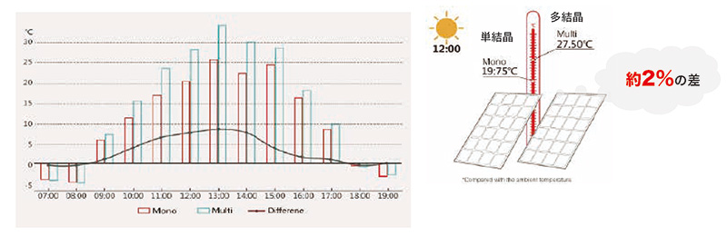 単結晶モジュールは、多結晶モジュールに比べて結晶構造に起因するロスが少ないため日射による温度上昇が少ない。