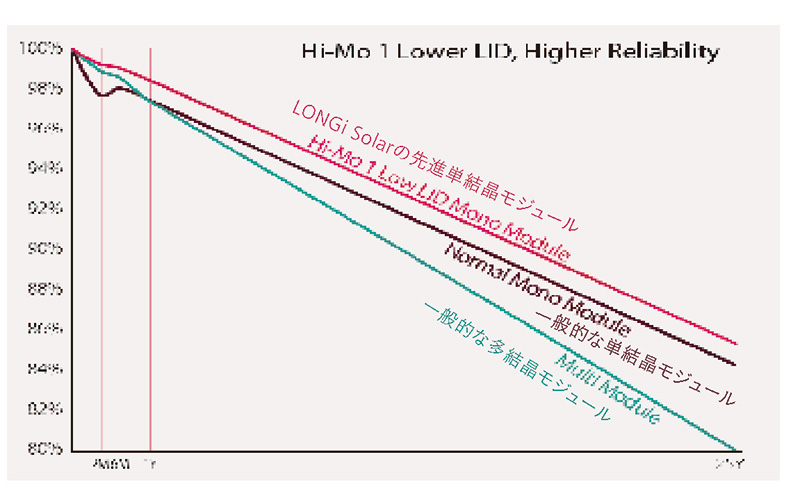 さらに、ロンジ・ソーラーでは、モジュール設置後の出力低下の要因となるLID(光誘起劣化)を抑制する技術開発も行っている。先進の単結晶PERC技術とあいまって、実発電量に優れた圧倒的な高効率・高出力化を実現している。