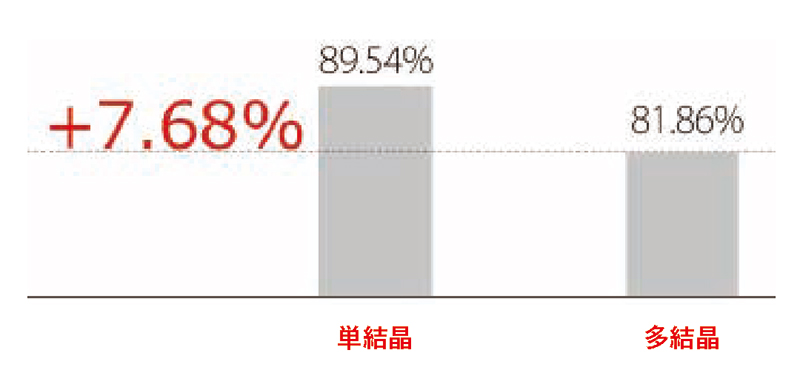 また、単結晶モジュールは曇天や朝晩など、低照度時の特性も優れているので、発電所に設置された状態での多結晶モジュールとの発電量の差は、STC(標準試験条件)での変換効率の違い以上に差が開くことになる。