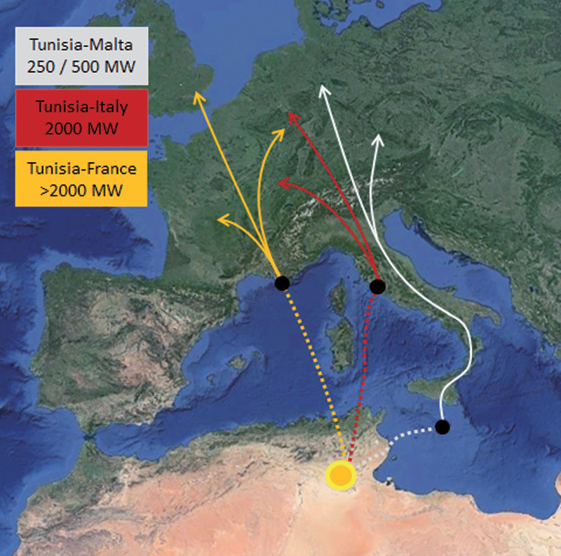 チュニジア南西部のサハラ砂漠に建設中の太陽光発電所で発電したソーラー電力を、海底ケーブルによってイタリアやフランス、マルタに供給する仕組みだ。
