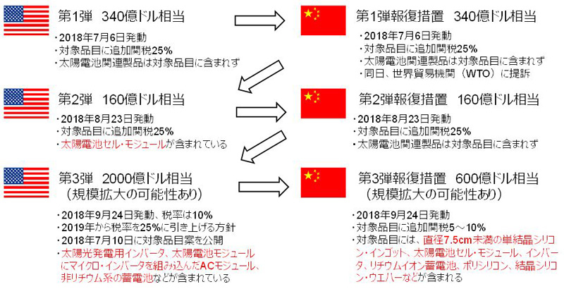 2018年3月にトランプ大統領は、中国の知的財産権侵害を理由として、米通商法301条に基づく制裁措置発動を決定した。これに反発した中国が報復措置を発動すると、米国は追加の制裁措置発動を決定、貿易摩擦が深刻化している。措置の対象品目に太陽電池セル・モジュールやインバータなどが含まれているが、中国から米国への太陽電池セル・モジュールの輸出量は減少しており、影響はさほど大きくない見通しである。