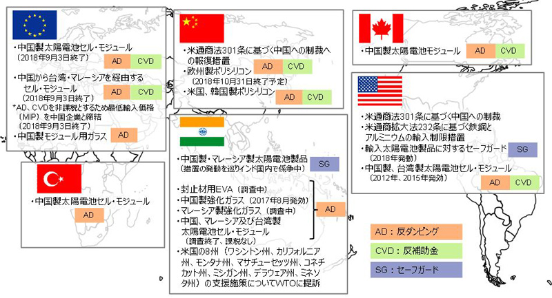 図に示すように、太陽電池を巡る貿易摩擦がさまざまな地域で生じている。