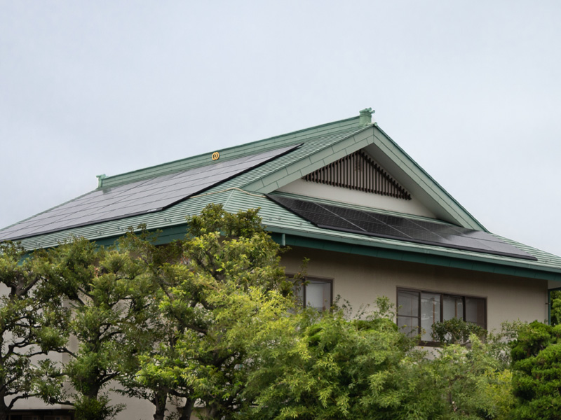 本堂南面と西面の屋根に合計12.16kWの太陽光パネルを設置。