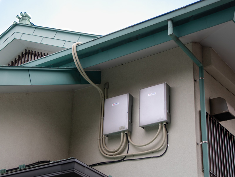 万一の洪水に備えて2階に据え付けられたパワーコンディショナ。避難所としての機能が失われないよう配慮されている。
