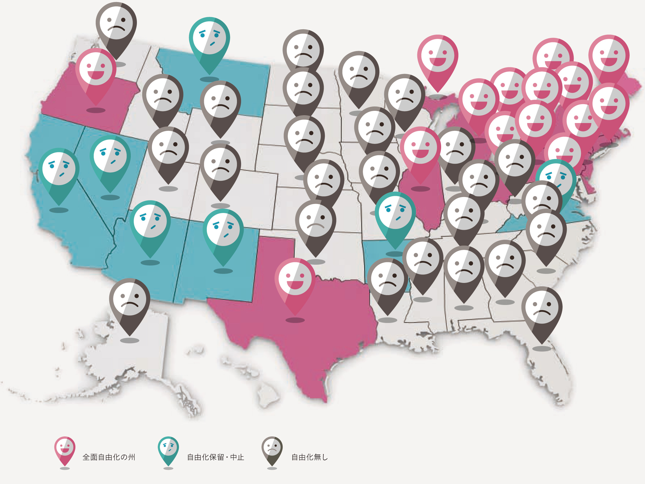 現在50州中14州およびワシントンDCで電力小売の全面自由化を実施中である。電力の規制が国レベルではなく州レベルで可決される米国では、自由化をしている州もあれば、しない州、さらにカリフォルニア州のように自由化を試みたが失敗し、自由化が「保留」になっている州も存在する。
