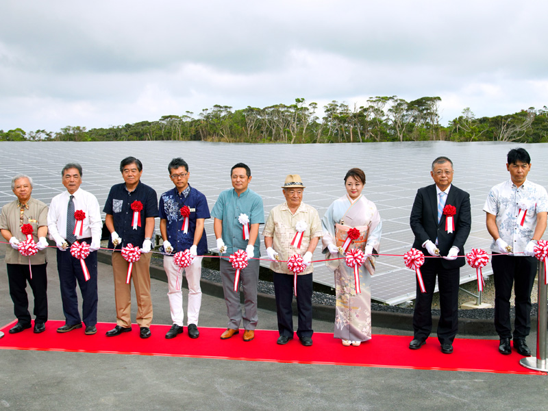 テープカットには、今帰仁村村長代理や沖縄海邦銀行頭取などが参加。地域に求められた太陽光発電所であることを象徴する一幕だ。
