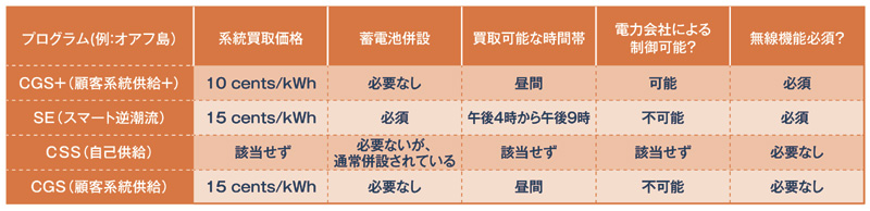 まず、「CGS+」はCGSにとって代わるもので、顧客は系統に流す電力を買い取ってもらえるが、電力会社が系統の安全と信頼度を保つため電力会社が認定した高性能な機器を設置し、 その機器を通して電力会社が遠隔測定・監視、そして必要によって制御できるようになっている。このプログラムもまた買取価格は島別で変わるが、オアフ島では1kWh当たり10.08セント、ラナイ島では20.90セントとなっている。このプログラムも設置容量制限があり、オアフ島では35MW、マウイ島7MW、そしてハワイ島で7MWとなっている。