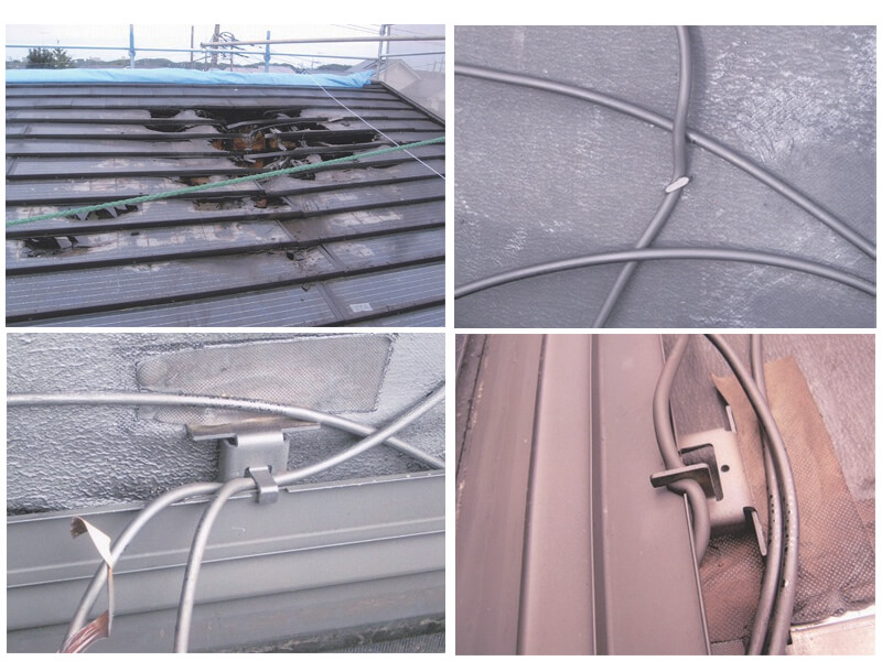 屋根一体型のモジュールが設置された築1年程度の住宅屋根部分から出火。出火の1ヶ月ほど前より、配電盤のブレーカが落ちたり、漏電が確認されたり、絶縁抵抗異常があったりした。「屋根の隙間から煙が出ている」と通行人が窓から声をかけて発見。住宅用火災警報器の発報はなく、居室内の人も気づかなかった。消防隊が小屋裏を確認すると、煙が充満し、炎が確認できた。モジュールを外し配線を確認すると、挟まれてつぶれている箇所や亀裂の入った箇所が数ヶ所あった。