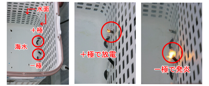 プラスチック容器に海水を入れ、カゴの編み目を利用して、+極とー極が水中から立ち上がるように固定。ストリングから約560Vの電気を供給する。供給しながら電極の心線が水面に沈んでいくようにカゴをゆっくり下げた。心線が水面に達した時、+極が放電し、ー極で水素が発生。さらに+極とー極が水面で放電し、60~70秒後にー極での発炎を確認。そのまま下げると水中でもー極での発炎が継続された。