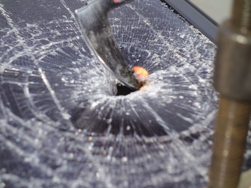 破壊器具にマイナス出力端子を接続してモジュール内電極と接触させた。最大電圧がかかる最悪の条件である。電圧は約250Vだ。モジュール内電極と破壊器具の間で放電が発生した。放電の熱により、樹脂が分解され発煙したり、発火したりする場合もあった。
