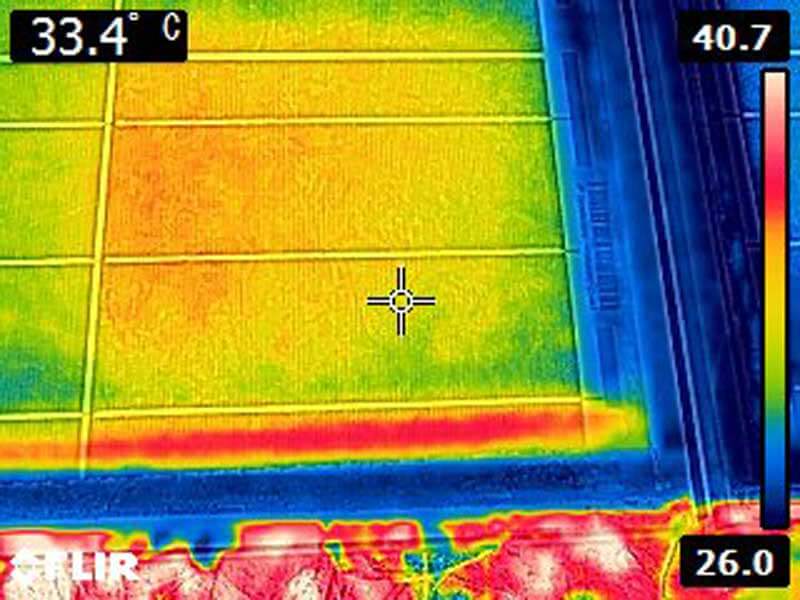 通常、こうした不具合があれば、メーカー保証(=パネル交換)の対象になりうる。ただ、不具合を証明するため、パネルの電流や電圧のチェックを求められることがある。サーモグラフィの画像があれば、一目でわかる不具合の証拠を示せるため、交渉を進める糸口として有効なのだ。発電を止めずに(=収益を下げずに)作業できる点も、サーモグラフィによる点検の利点だ。