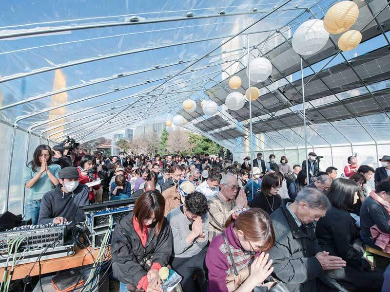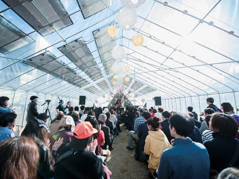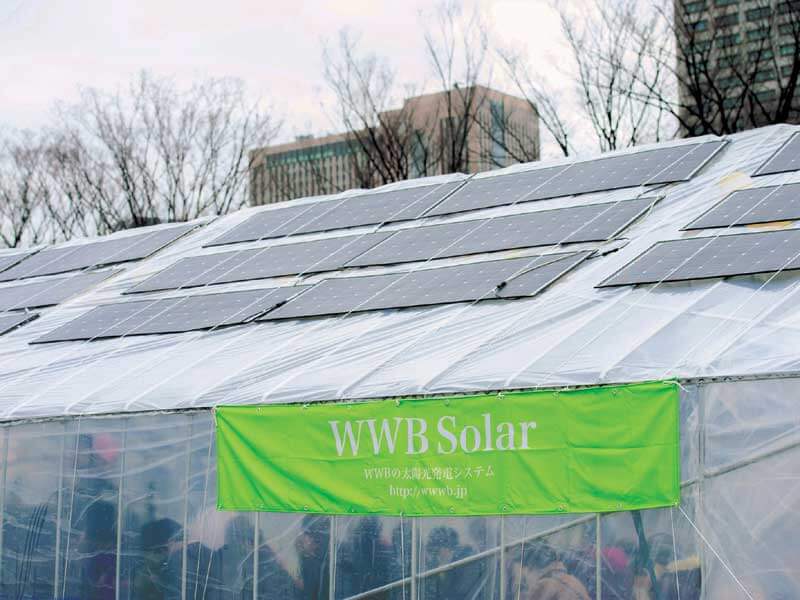 昨年とはやや趣を変え、「祈りを捧げる場」として整えられた会場の中心となったのは、WWBのソーラーシェアリングシステムを応用した「ソーラードームステージ」。間口7m×奥行き14mのオリジナルフレームを使用したビニールハウスの屋根面に、同社の超軽量ソーラーパネル「マクサライト」215W×36枚を装備。約8kWhの発電量で、蓄電池を介してステージの音響や照明などにそのまま活用された。