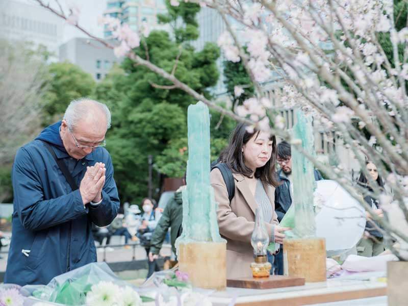 当日は、前日からの雨と風で一時は開催も危ぶまれるほどの天気の荒れ模様だったが、午前中には天気も回復。季節的には暑く感じられるほどの日差しが溢れる中、無事8回目を迎える追悼イベントは執り行われた。会場入り口に設けられた献花台には桜の木もあしらわれ、後を絶たない来場者が祈りを捧げる場に、優しい雰囲気も添えられていた。