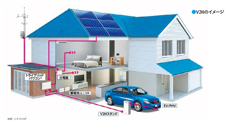 据え置き型の定置用蓄電池だけが、蓄電システムではない。次世代自動車の普及とともに、EV(電気自動車)やPHV(プラグインハイブリッド車)を「走る蓄電池」として活用するケースも増えてきた。クルマのバッテリーと家の電気を連携させるV2H(Vehicle to Home)だ。EVに搭載されているバッテリー容量は、一般的な定置用蓄電池の容量をはるかに超えるものであり、専用機器を用意すれば家庭用蓄電池としても活用することができる。昼間あまり乗らない人には、太陽光発電用の蓄電システムとしてもおすすめなのだ。