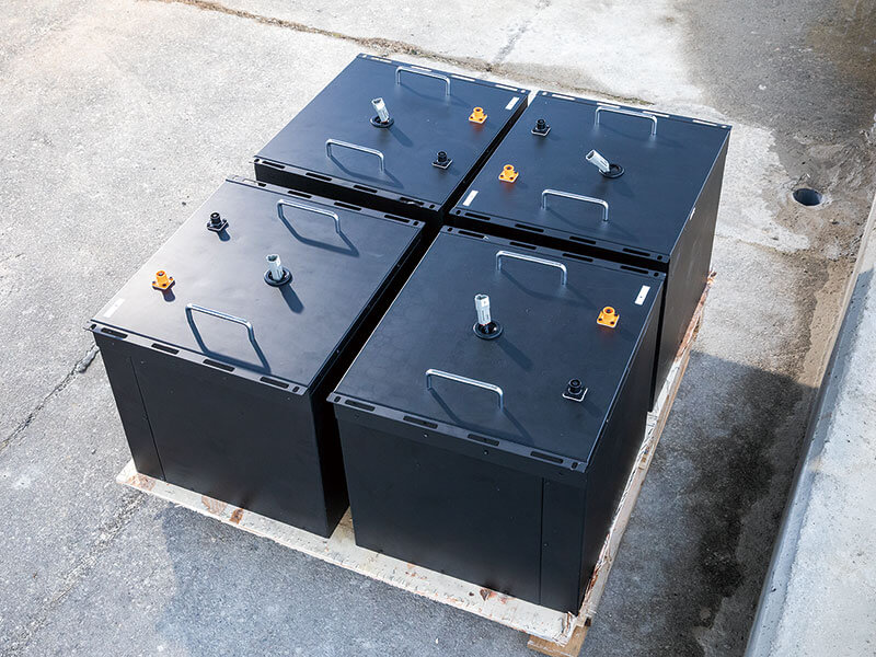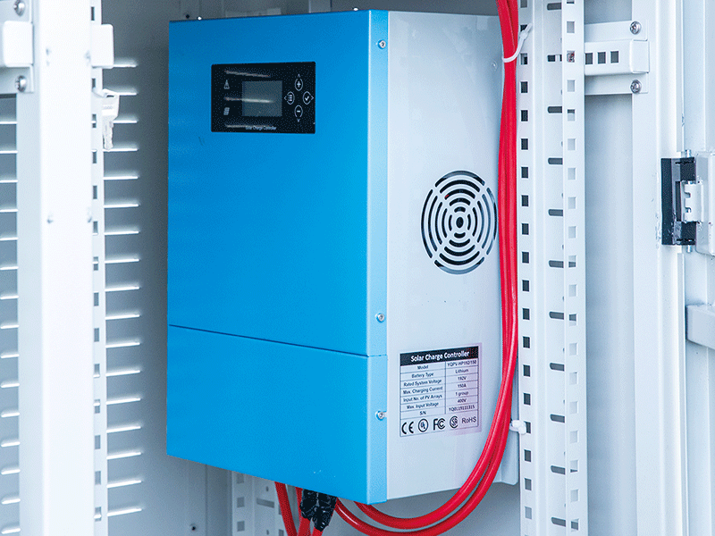 蓄電システムの筐体内に備え付けられたチャージャー。パネルからの発電と蓄電池の充放電をコントロールし、ハウス内の電力を調整する。