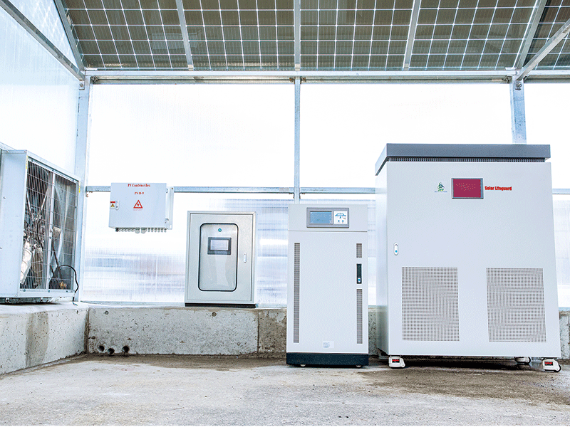 ハウスに内に設置するのは、大容量60kWhの蓄電システムをはじめとしたオフグリッドシステムのパッケージ。充放電をコントロールし、ハウス内の電力を自然エネルギーで賄う。
