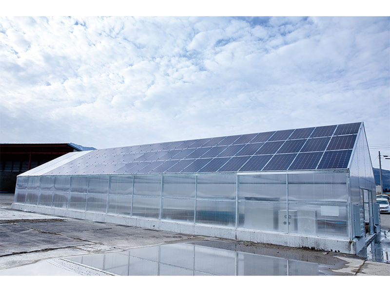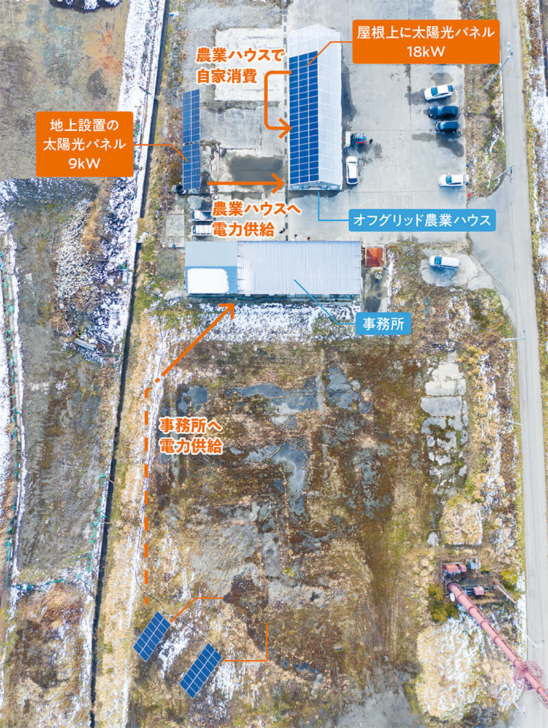 ハウスへの給電は、ハウス屋根と地上に設置された太陽光パネルから行う。事務所へも、地上設置の太陽光パネルから給電し、自然エネルギーを最大限活用する。