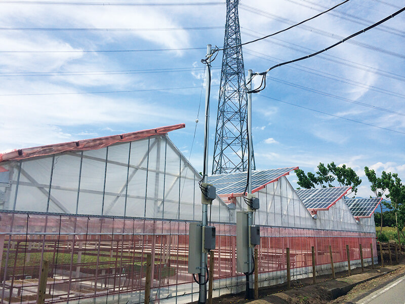 架台メーカー・日本BSLが架台を提供したソーラーシェアリング事例の一部。農地の上に設置する一般的な方法だけでなく、ハウス施設の屋根に設置するという選択肢もある。営農と発電を両立する方法は架台によって可能性が広がるのだ。