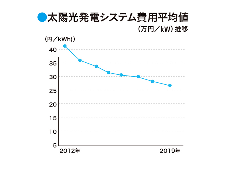 1つ目のメリットは、電気代を削減できること。気になる導入コスト(太陽光発電設備の代金等)は、以前に比べて格段に安くなっているので、数年で元を取ることができる。