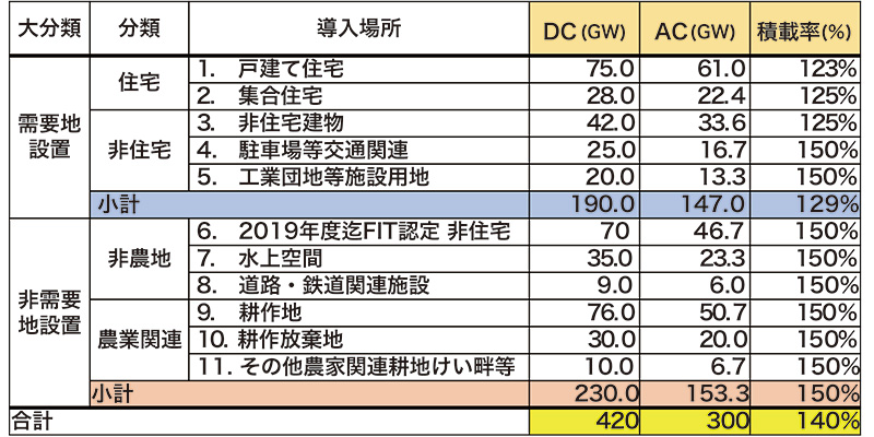 JPEAの『PV OUTLOOK2050』では、想定導入場所を11に分け、300GW(AC)導入時の、それぞれの導入量を算出しました(表)。戸建て住宅や集合住宅にはまだまだ導入の余地がありますし、非住宅建物への導入が本格化するのはこれからです。ソーラーシェアリングなどにより農業関連への導入が進むことも期待されます。耕作地・耕作放棄地を合わせた導入量は、70GW(AC)以上に達することを想定しています。また、水上空間にも大きな可能性が残されています。今後の技術開発により、変換効率の向上や軽量化などがさらに進めば、設置可能な場所はいっそう広がっていくと考えています。