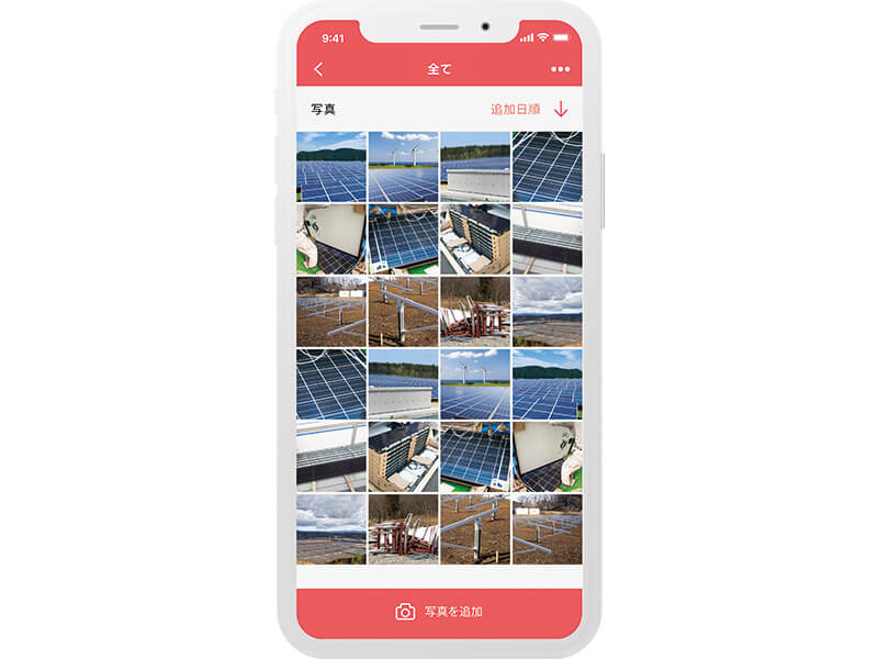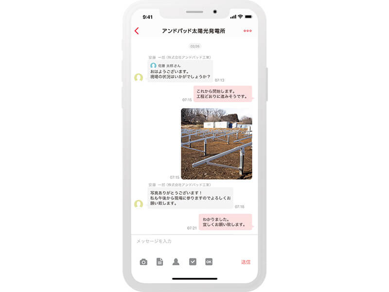 太陽光発電所の現場で撮影した画像を、ANDPADにアップするだけで、チーム内でカンタン共有。ANDPADのチャット機能で報告もスムーズ。画像に限らずプロジェクトに関わる情報をすぐにシェアできるのがポイントだ。