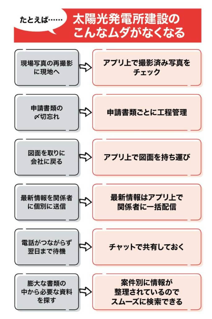 写真も共有でき、画像を見ないと分からない問題でも再撮影のために現地へ行かずともアプリ上ですぐに対応できる。工程に変更が生じてもアプリ上で更新すればすぐに関係者が確認できる。こうした積み重ねで、人員の移動や確認の時間を大幅に減らしてコスト削減につながる上に、連絡ミスや報告漏れを防げる。