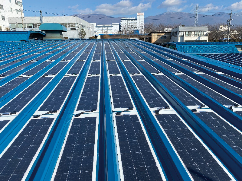 同社にとって日本初のオフグリッド発電所の舞台となったのは、カラー鋼板屋根の工場。4ヶ月間の施工や試験を経て稼働開始に至った。