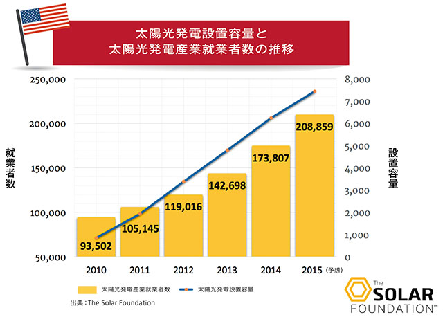 2010年から太陽光発電産業の国勢調査を行っている米独立非営利団体ソーラー・ファウンデーション(TheSolarFoundation)によると、2010年には10万人に満たなかった米国全土における太陽光発電産業の就業者数は、2015年時点では123%増しの20万8千人を超えるまでに成長した。さらに、同団体によると、2015年において新規雇雇用創出用創出の83件のうち1件は太陽光発電関連の雇用であったそうだ。それは、2015年に全米で創出された雇用の1・2%にも当たる。