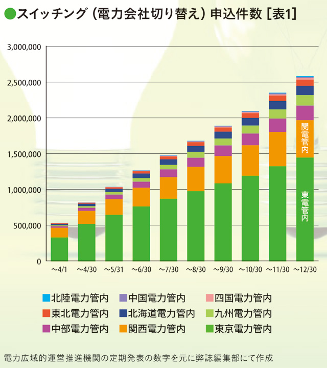 では実際のところ、一般家庭によるスイッチング(電力会社の切り替え)は、どの程度まで進んでいるのか。上の表(表1)を見てほしい。これは電力広域的運営推進機関が定期発表しているスイッチング申込件数をまとめたものだが、昨年末(2016年12月31日)時点で250万件を突破したことが分かる。正確には、257万4500件。それまで旧一般電気事業者がもっていた総契約口数の4.1%(スイッチング率)に相当する件数だ。