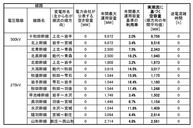 実潮流に基づく空き容量の年間平均値は、最小の奥羽幹線(羽後~宮城)でも1154MW、最大の十和田幹線(上北~岩手)に至っては9756MWもある。さらに、懸念材料とされてきた送電混雑も、実際には年間を通じて全く発生していないことが明らかになった。