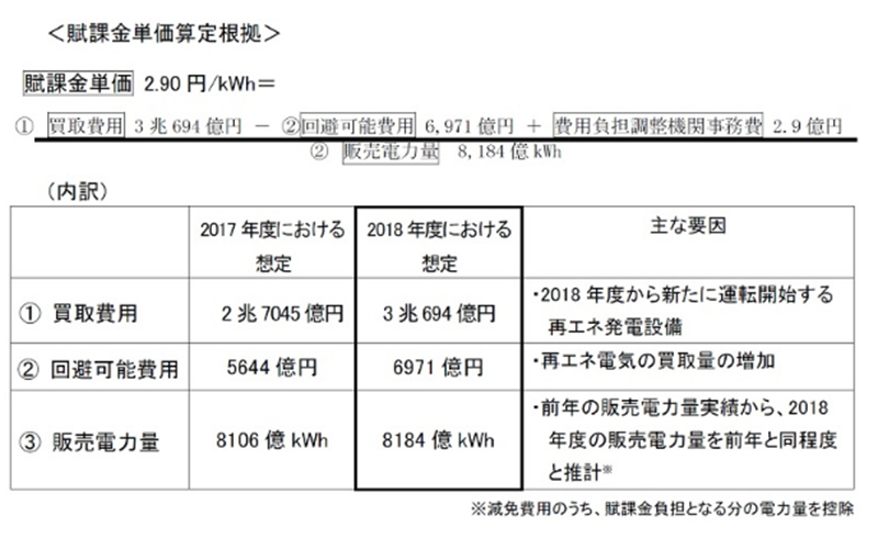 以上の買取価格を踏まえ、2018年度の賦課金単価は1kWhあたり2.90円で決定。なお、この単価は2018年5月から2019年4月検針分の電気料金まで適用される。