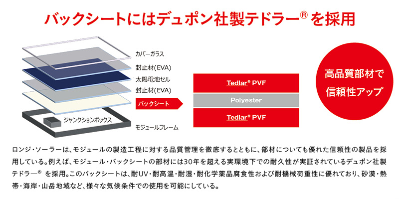 長期信頼性へのこだわりは、使用する素材の1つ1つにまで及ぶ。例えば、バックシートには世界的評価の高いデュポン社製テドラーを採用し、厳しい気候条件下でも安心して使用できる耐久性を確保している。