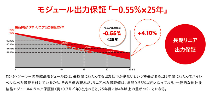 さらに、長期にわたっても出力低下が少ないという特長があるので、生涯発電量には大きな違いが生じてくる。FIT期間を超える25年間に、ハイレベルな出力保証を付けているのもロンジ・ソーラーならではだ。